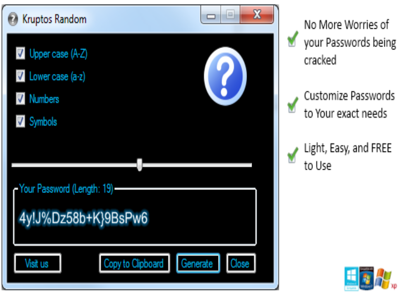 Kruptos 2 Random is a small, free utility that creates random passwords that are highly secure and extremely hard to guess or crack. Create passwords up to 32 characters long using a combination of upper case, lower case, numbers and symbols